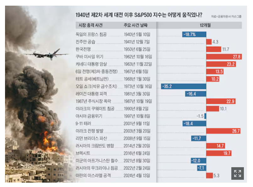 제가 이번에 자료를 찾아보면서 알게 된 흥미로운 사실이 있습니다. 미국의 금융 자문사 카슨그룹이 지난 86년간 주요 지정학적 사건 43건 이후 S&P500 지수의 변화를 분석했는데, 1년 후 평균 3% 상승했다는 결과가 나왔습니다(출처: The Motley Fool). 여기서 S&P500이란 미국 뉴욕 증권거래소에 상장된 500개 대형 기업의 주가를 추적하는 지수로, 미국 경제 전체의 건강 상태를 보여주는 대표적인 지표입니다.